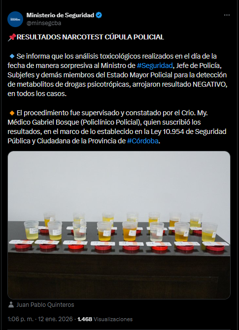 Este lunes a la mañana, en Jefatura de Policía, el Ministro de Seguridad de Córdoba, Juan Pablo Quinteros, con la presencia del Jefe de Policía Crio. General Lic. Marcelo Marín, subjefes y directores generales, dispuso la realización de un test sorpresivo a la totalidad de los integrantes del Estado Mayor Policial para determinar presencia de metabolitos de drogas psicotrópicas ilegales.