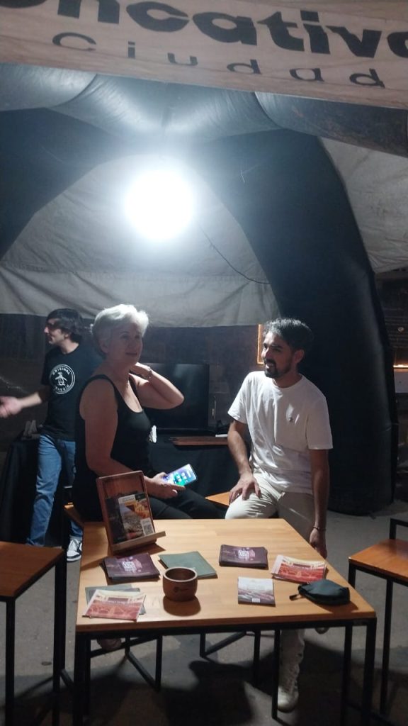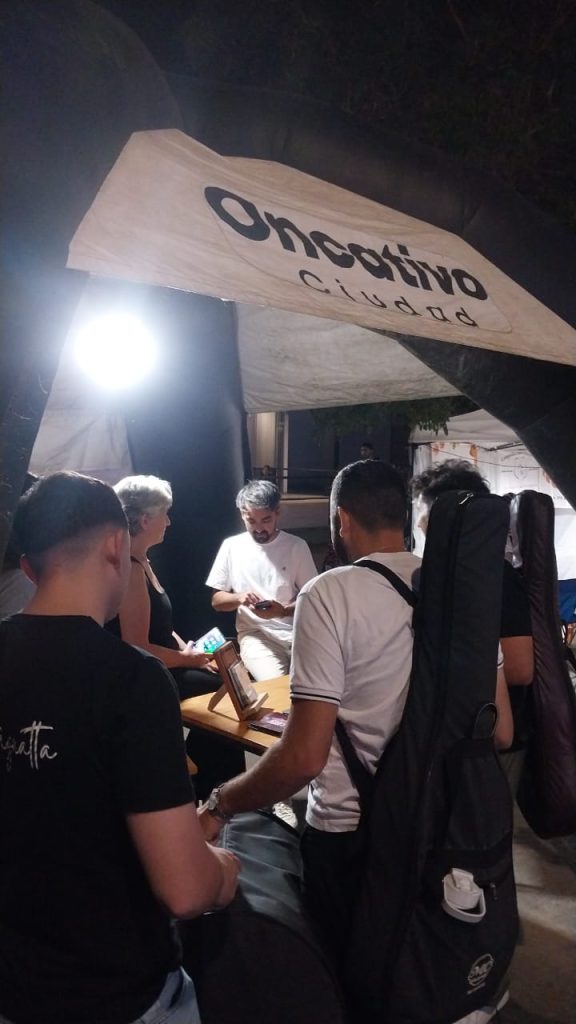 Los puestos de la costanera generan una movida paralela a todo lo que se vive dentro del Anfi, y nos encontramos con Jonatan, con un puesto que promociona las bondades de los salames de Oncativo y los diversos atractivos que tiene esa ciudad, situada a unos 78 kilómetros de nuestra villa.