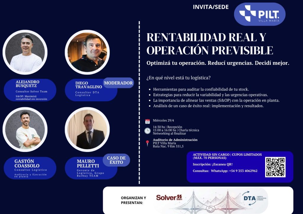 El evento propone brindar a las pymes industriales herramientas de campo y metodologías probadas para optimizar su operación, reducir urgencias diarias y mejorar la toma de decisiones sin necesidad de encarar grandes inversiones. La organización está a cargo de los consultores logísticos Diego Travaglino (DTA logística), Alejandro Busquetz (Solver Team) y Gastón Coassolo (DTA logística / Solver Team).