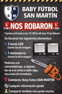 El club del barrio San Martín fue víctima de un robo que generó profunda tristeza entre sus integrantes, a pocos días del inicio de la liga del Torneo Apertura. Delincuentes sustrajeron reflectores nuevos destinados a iluminar la cancha y una motosierra que estaba siendo pagada en cuotas.