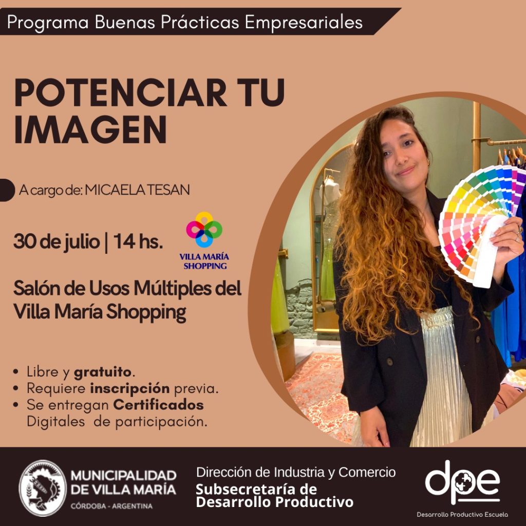 La Subsecretaría de Desarrollo Productivo presenta la capacitación “Potenciar tu Imagen” el próximo martes en el Villa María Shopping, de 14:00 a 16:00 horas.