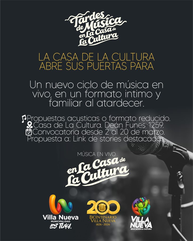 VILLA NUEVA TENDRÁ “TARDES DE MÚSICA EN LA CASA DE LA CULTURA” Y CONVOCA A ARTISTAS