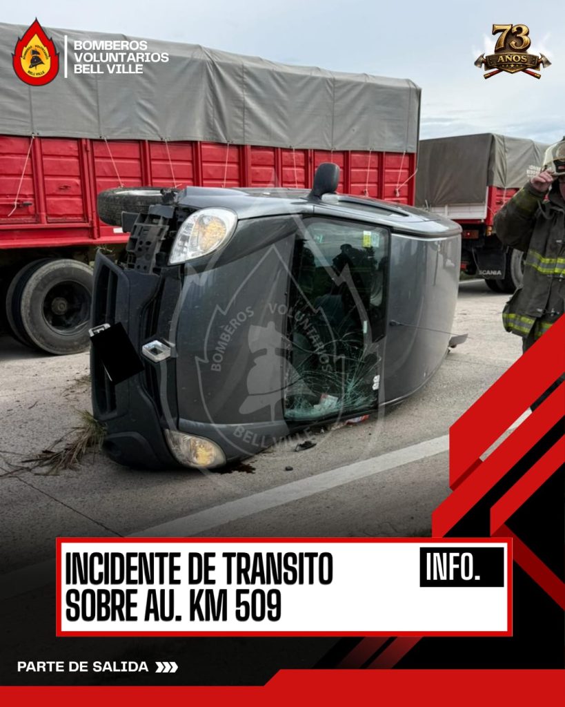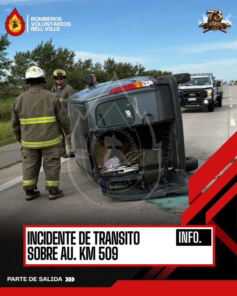 Este viernes, a las 15:16, los bomberos de Bell Ville acudieron a un accidente ocurrido sobre la Autopista Rosario- Córdoba, a la altura del km 509, aproximadamente, donde una Renault Kangoo sufrió un vuelco en solitario.